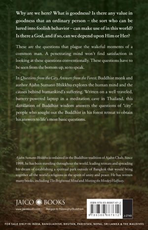 In Questions from the City, Answers from the Forest, Buddhist monk and author Ajahn Sumano Bhikkhu explores the human mind and the causes behind humankind’s suffering. Written on a well-traveled, battery-powered laptop in a meditation cave in Thailand, this distillation of Buddhist wisdom answers the questions of “city” people who sought out the Buddhist in his forest retreat to obtain his answers to life’s most basic questions.