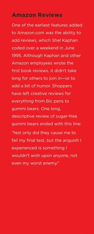 One of the earliest features added to Amazon.com was the ability to add reviews, which Shel Kaphan coded over a weekend in June 1995. Although Kaphan and other Amazon employees wrote the first book reviews, it didn’t take long for others to join in—or to add a bit of humor. Shoppers have left creative reviews for everything from Bic pens to gummi bears. One long, descriptive review of sugar-free gummi bears ended with this line: