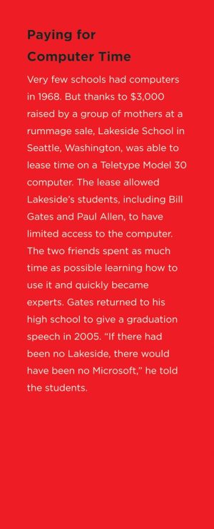 Very few schools had computers in 1968. But thanks to $3,000 raised by a group of mothers at a rummage sale, Lakeside School in Seattle, Washington, was able to lease time on a Teletype Model 30 computer. The lease allowed Lakeside’s students, including Bill Gates and Paul Allen, to have limited access to the computer. The two friends spent as much time as possible learning how to use it and quickly became experts. Gates returned to his high school to give a graduation speech in 2005. “If there had been no Lakeside, there would have been no Microsoft,” he told the students.