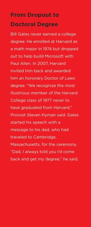 Bill Gates never earned a college degree. He enrolled at Harvard as a math major in 1974 but dropped out to help build Microsoft with Paul Allen. In 2007, Harvard invited him back and awarded him an honorary Doctor of Laws degree. “We recognize the most illustrious member of the Harvard College class of 1977 never to have graduated from Harvard,” Provost Steven Hyman said. Gates started his speech with a message to his dad, who had traveled to Cambridge, Massachusetts, for the ceremony. “Dad, I always told you I’d come back and get my degree,” he said.