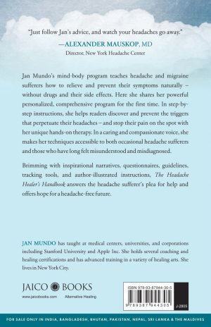 Jan Mundo’s mind-body program teaches headache and migraine sufferers how to relieve and prevent their symptoms naturally – without drugs and their side effects. Here she shares her powerful personalized, comprehensive program for the first time. In step-by-step instructions, she helps readers discover and prevent the triggers that perpetuate their headaches – and stop their pain on the spot with her unique hands-on therapy. In a caring and compassionate voice, she makes her techniques accessible to both occasional headache sufferers and those who have long felt misunderstood and misdiagnosed.