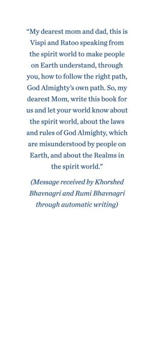 “My dearest mom and dad, this is Vispi and Ratoo speaking from the spirit world to make people on Earth understand, through you, how to follow the right path, God Almighty’s own path. So, my dearest Mom, write this book for us and let your world know about the spirit world, about the laws and rules of God Almighty, which are misunderstood by people on Earth, and about the Realms in the spirit world.”