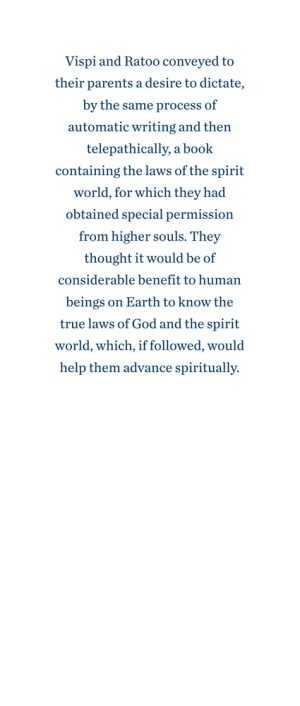 Vispi and Ratoo conveyed to their parents a desire to dictate, by the same process of automatic writing and then telepathically, a book containing the laws of the spirit world, for which they had obtained special permission from higher souls. They thought it would be of considerable benefit to human beings on Earth to know the true laws of God and the spirit world, which, if followed, would help them advance spiritually.