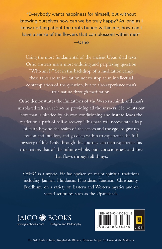 Using the most fundamental of the ancient Upanishad texts Osho answers man’s most enduring and perplexing question “Who am I?” Set in the backdrop of a meditation camp, these talks are an invitation not to stop at an intellectual contemplation of the question, but to also experience man’s true nature through meditation.
