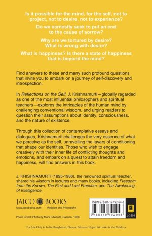 In Reflections on the Self, J. Krishnamurti—globally regarded as one of the most influential philosophers and spiritual teachers—explores the intricacies of the human mind by challenging conventional wisdom, and urging readers to question their assumptions about identity, consciousness, and the nature of existence.