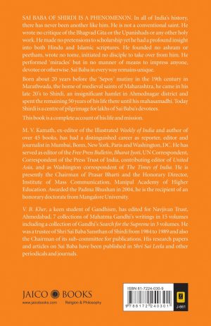 Born about 20 years before the ‘Sepoy’ mutiny in the 19th century in Marathwada, the home of medieval saints of Maharashtra, he came in his late 20’s to Shirdi, an insignificant hamlet in Ahmednagar district and spent the remaining 50 years of his life there until his mahasamadhi. Today Shirdi is a centre of pilgrimage for lakhs of Sai Baba’s devotees. This book is a complete account of his life and mission.