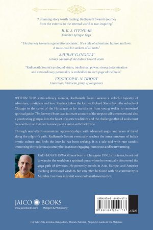 Within this extraordinary memoir, Radhanath Swami weaves a colorful tapestry of adventure, mysticism and love. Readers follow the former Richard Slavin from the suburbs of Chicago to the caves of the Himalayas as he transforms from young seeker to renowned spiritual guide. The Journey Home is an intimate account of the steps to self-awareness and also a penetrating glimpse into the heart of mystic traditions and the challenges that all souls must face on the road to inner harmony and a union with the Divine.