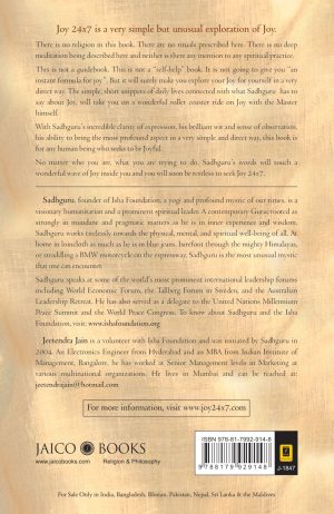There is no religion in this book. There are no rituals prescribed here. There is no deep meditation being described here and neither is there any mention to any spiritual practice. This is not a guidebook. This is not a “self-help” book. It is not going to give you “an instant formula for joy”. But it will surely make you explore your Joy for yourself in a very direct way. The simple, short snippets of daily lives connected with what Sadhguru has to say about Joy, will take you on a wonderful roller coaster ride on Joy with the Master himself. With Sadhguru’s incredible clarity of expression, his brilliant wit and sense of observation, his ability to bring the most profound aspect in a very simple and direct way, this book is for any human being who seeks to be Joyful. No matter who you are, what you are trying to do, Sadhguru’s words will touch a wonderful wave of Joy inside you and you will soon be restless to seek Joy 24×7.