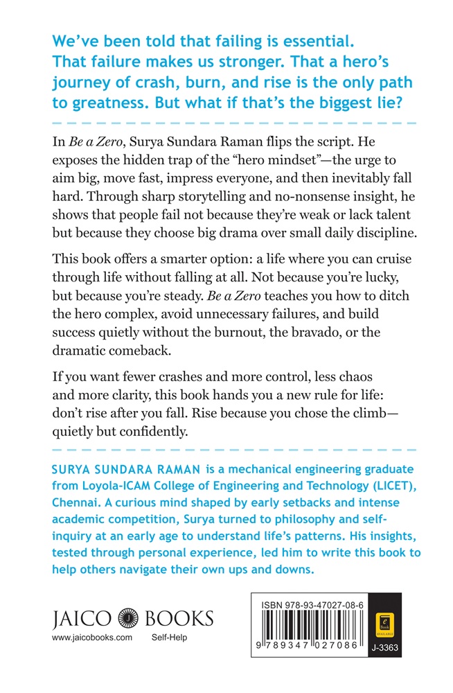 In Be a Zero, Surya Sundara Raman flips the script. He exposes the hidden trap of the “hero mindset”—the urge to aim big, move fast, impress everyone, and then inevitably fall hard. Through sharp storytelling and no-nonsense insight, he shows that people fail not because they’re weak or lack talent but because they choose big drama over small daily discipline.