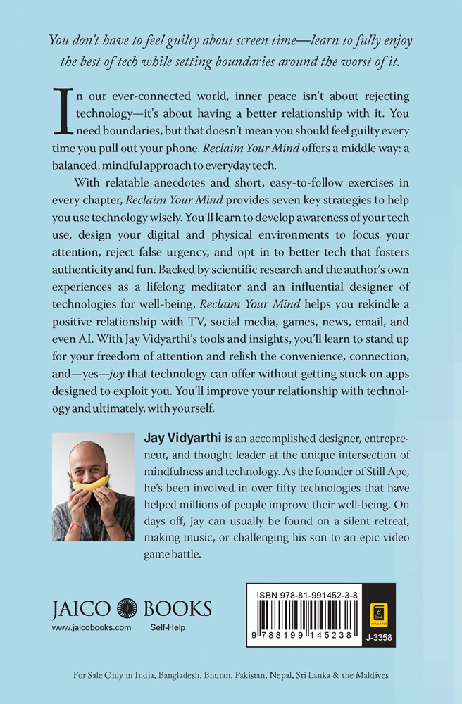 With relatable anecdotes and short, easy-to-follow exercises in every chapter, Reclaim Your Mind provides seven key strategies to help you use technology wisely. You’ll learn to develop awareness of your tech use, design your digital and physical environments to focus your attention, reject false urgency, and opt in to better tech that fosters authenticity and fun. Backed by scientific research and the author’s own experiences as a lifelong meditator and an influential designer of technologies for well-being, Reclaim Your Mind helps you rekindle a positive relationship with TV, social media, games, news, email, and even AI. With Jay Vidyarthi’s tools and insights, you’ll learn to stand up for your freedom of attention and relish the convenience, connection, and—yes—joy that technology can offer without getting stuck on apps designed to exploit you. You’ll improve your relationship with technology and ultimately, with yourself.