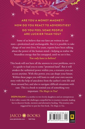 This book will not have all the answers to your problems, nor is it a guide to lead you to some “promised land”. But it will awaken the unlimited power within you, a resource you can access anytime. With this power, you can shape your future. Within these pages you will learn to craft your own success story with the help of anecdotes from the author’s own life and those around her, and also to navigate difficult situations with ease. This is a book to remind you of something very important: The Magic in You!